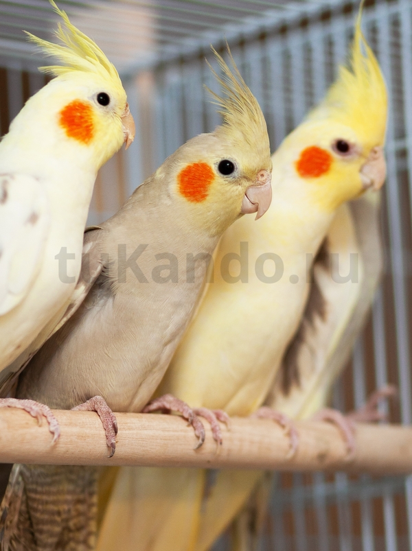 Альбинос (белый с красными глазами). Его характеризует полное отсутствие пигмента. Окраска этих птиц полностью белая, иногда с кремовым налётом. Голова и перья, образующие хохолок, желтые. Пятна по бокам головы идентичны у особей обоего пола. Самец белее самки. У самки можно заметить бледно-желтые пятна на крыльях и перьях подхвостья, которые иногда создают впечатление мраморной окраски.